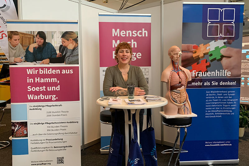 Die Messe läuft wirklich sehr gut. Besucherzahlen sind gefühlt sehr hoch, viele Gespräche wurden geführt und noch mehr Flyer verteilt“, freut sich Carolin Reitemeyer. „Die Menschen interessieren sich neben der 3-jährigen auch für die 1-jährige Ausbildung. Auch die neue Pflegeschule in Rimbeck findet Anklang.