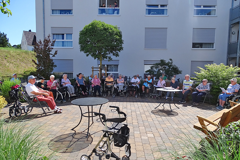Der Sinnesgarten im Innenhof von HAUS PHÖBE bietet durch seine Gestaltung mit Wasser, Pflanzen und schattigen Bereichen eine angenehme Atmosphäre, die zur Entspannung einlädt. Das Singen setzt Glückshormone frei und kann Stress reduzieren, was bei Hitze besonders wohltuend sein kann. Die Mitarbeiterinnen aus dem Sozialen Dienst haben dies gewusst und die Bewohnerinnen und Bewohner von Haus Phöbe sangen aus voller Kehle in angenehmer Umgebung.
