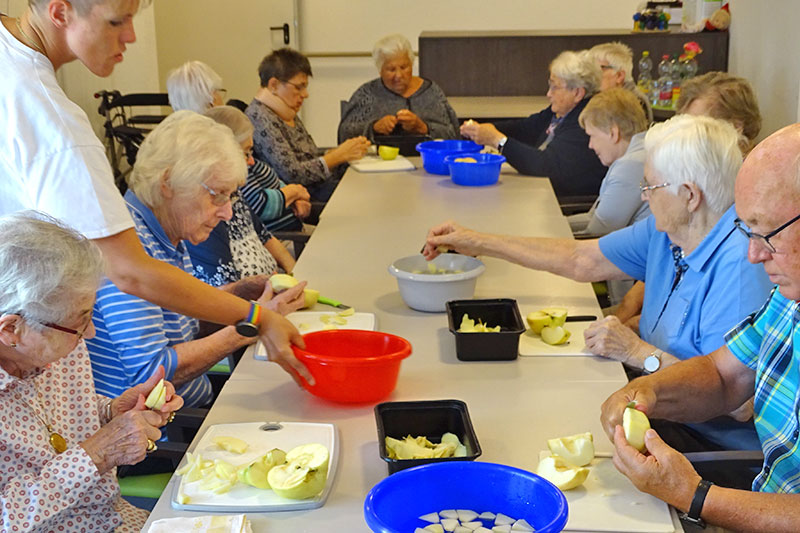 Was macht man aus rote Beete und Kartoffeln? Leckere Rote Bete-Kartoffelpuffer. Die Bewohnerinnen und Bewohner schälten Kartoffeln, kochten Apfelmus und rieben rote Bete. Dabei wurde viel erzählt. Danach wurde alles – mit viel Genuß – verköstigt.