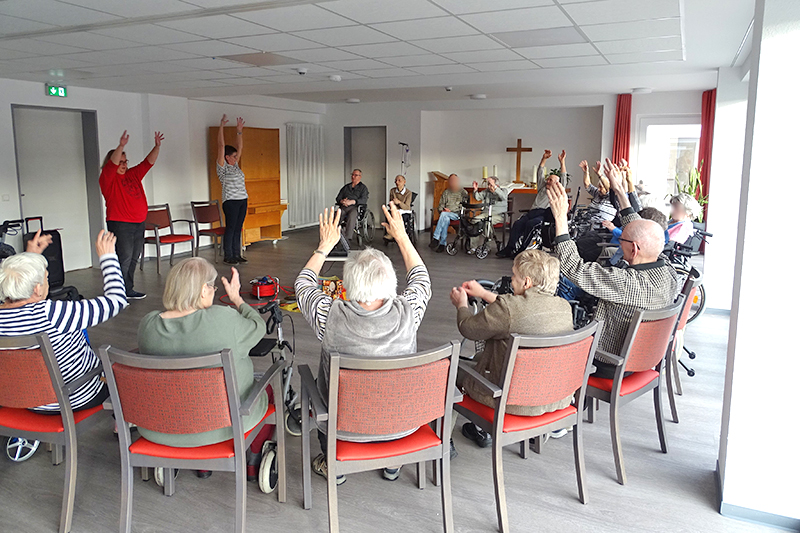 Die Gruppe aus Bewohnerinnen und Bewohner im Haus Phöbe konnte dies gut ausgiebig Anfang November genießen. Die dazu angeleiteten Sitztänze taten ihr Übriges dazu: das Herz-Kreislauf-System wurde aktiviert und die Beweglichkeit wurde gefördert.