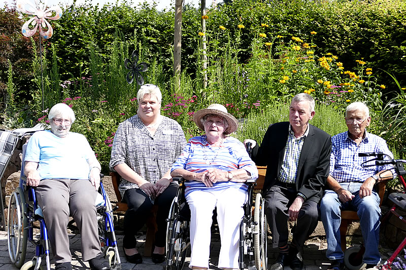 „65 Jahre ein Alten- und Pflegeheim zu sein, ist was Besonderes.“ Darüber waren sich Heimleiterin Christiane Vößing (2.v.l.), Pfarrer Karl-Ludwig Wendrich (2.v.r.) und die Bewohnerinnen Maria Schulte, Helgard Boge und Bewohner Karl-Josef Scheideler (v.l.n.r.) einig.