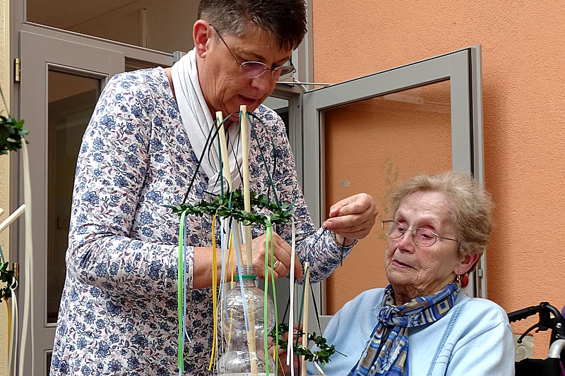 Mit einem Gottesdienst in der Kapelle startet der 2. Thementag von Haus Phöbe. Im Anschluss daran wurden mit den Anwesenden kleine Tisch-Maibäume hergestellt.