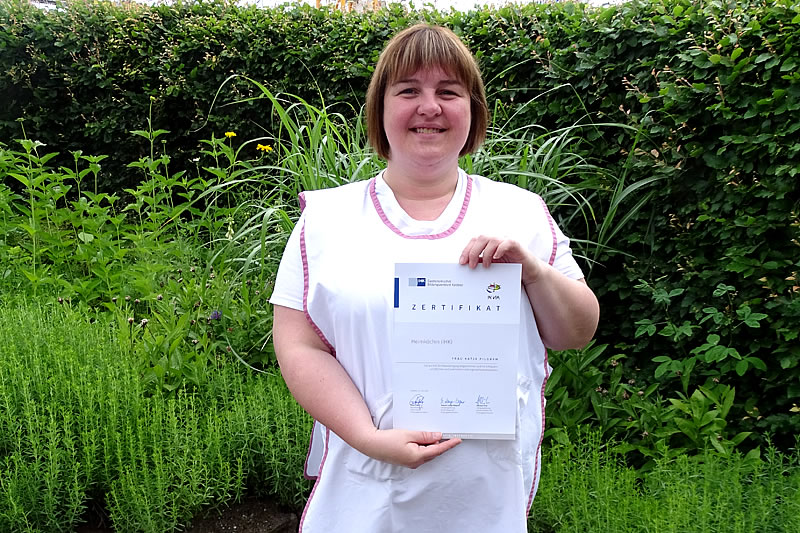Katja Pilgram hat die Weiterbildung vom 7. September 2020 bis 22. Juni 2021 besucht und mit sehr großem Erfolg – testiert im Zertifikat - abgeschlossen. Das spannende Thema ihrer Projektarbeit lautete: „Das Auge isst mit – Angepasste Kostformen bei Kau- und Schluckbeschwerden“.