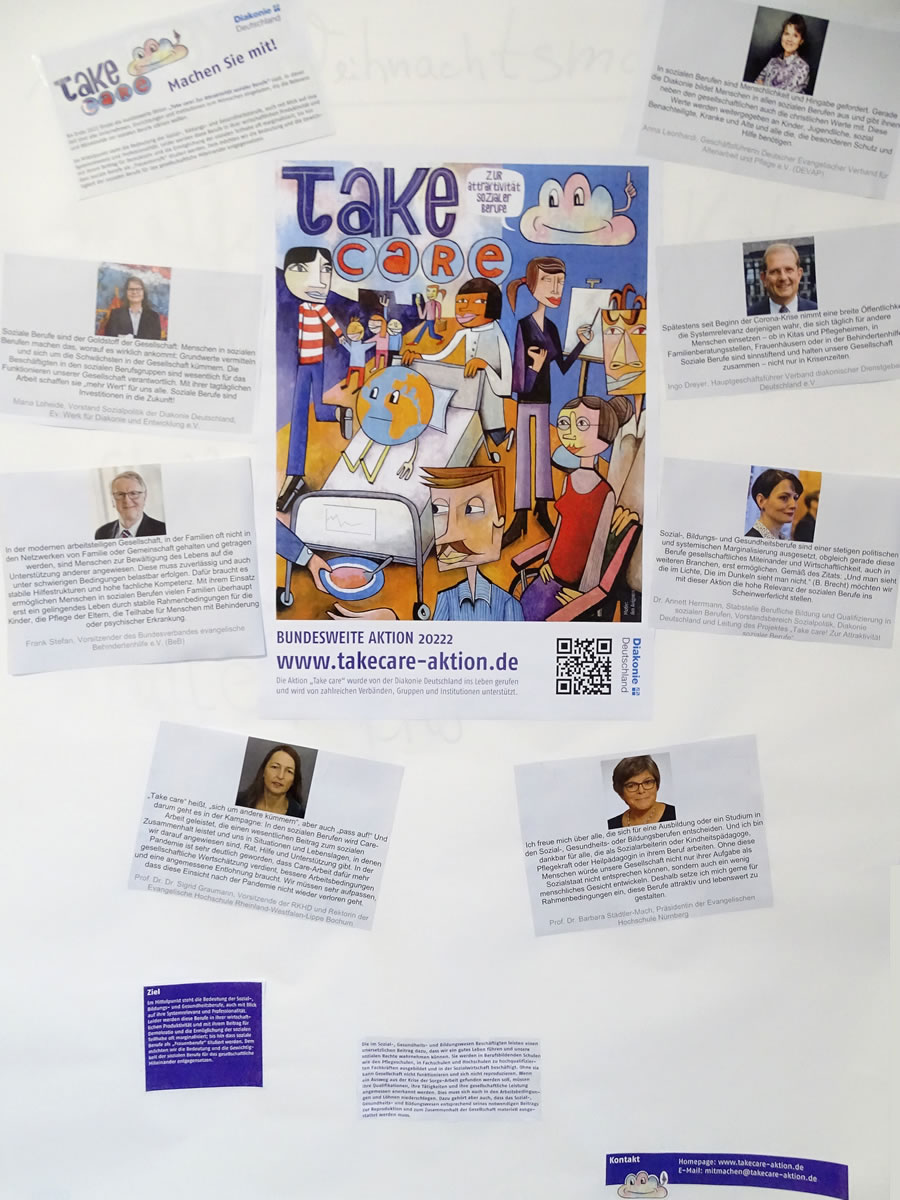 Take Care!, die Aktion der Diakonie, versucht seit 2021 das Augenmerk auf die Bedeutung der sozialen Berufe und das Besondere an den Arbeitsfeldern der Sozial-, Bildungs- und Gesundheitsberufe zu legen und öffentlich zu machen.