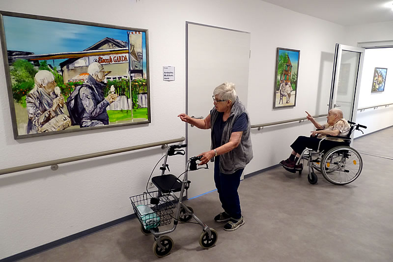 Seit Mitte Juni verschönert weitere Kunst Haus Phöbes Aufenthaltsbereiche und Flure. Diese finden großen Anklang. Auch Bewohner*innen anderer Etagen kommen und betrachten die Gemälden. Eine der Frauen, die früher selbst mit Öl gemalt hat, strahlte und war begeistert, dass Kunst ins Haus Einzug gehalten hat.