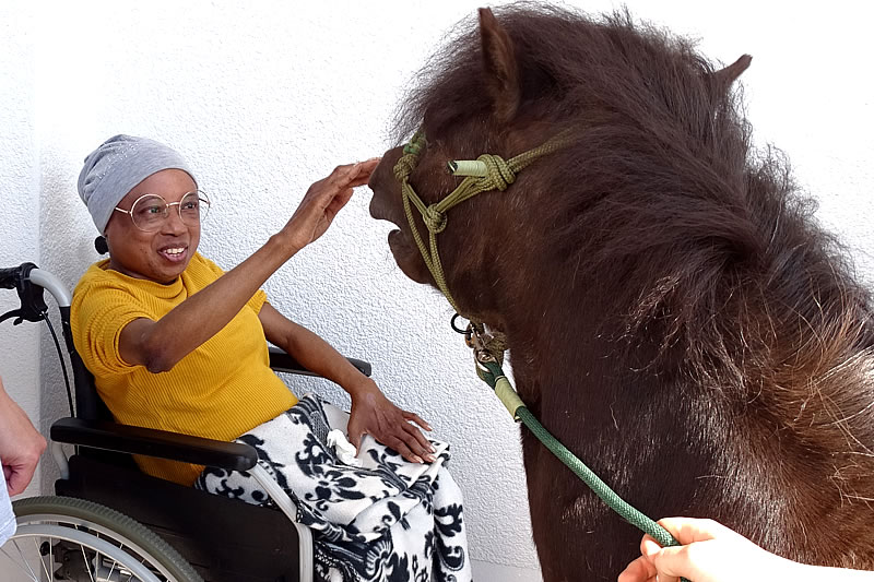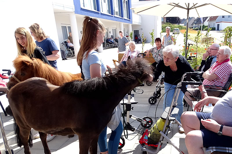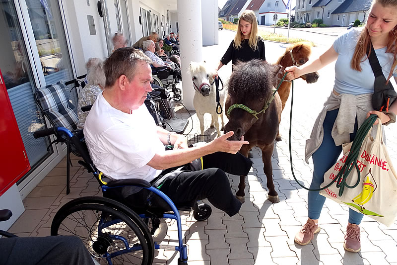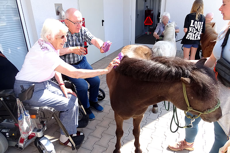 Zwei junge Frauen aus Rimbeck kamen Anfang Juni mit ihren drei Shetland-Ponys im HAUS PHÖBE vorbei. Bei bestem Sommerwetter konnten die Ponys gestreichelt, gestriegelt und mit Möhren gefüttert werden. Das Angebot führte zu vielen glücklichen Gesichter. Dieser Tag wird mit Sicherheit lange in Erinnerung bleiben.