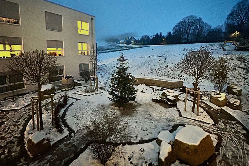 Ein Tannenbaum wurde im neu entstehenden Innenhof aufgestellt und mit Lichtern versehen. Der Sinnesgarten für die Menschen, die im Alten- und Pflegeheim Haus Phöbe leben, existiert nun zu mehr als 85%, rechtzeitig zur Adventszeit. Hier sieht man ihn in den frühen Morgenstunden leuchten.