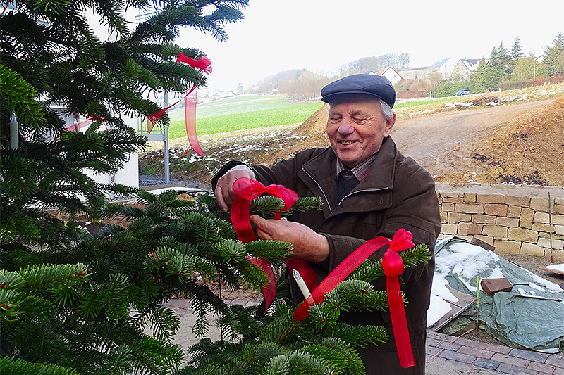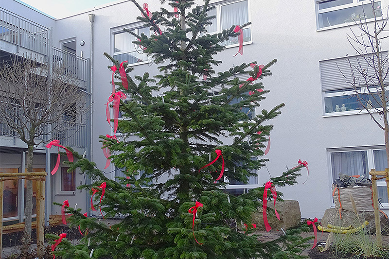 „Was für ein schöner Blick nun aus meinem Fenster!“ freute sich eine der Bewohnerinnen lautstark. Ein Tannenbaum wurde Ende November im neu entstehenden Innenhof aufgestellt und mit Lichtern versehen. Nun wurde er mit den Bewohner*innen gemeinsam mit roten Schleifen versehen.