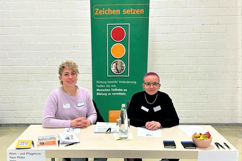 Praxisanleiterin und Pflegefachkraft Jasmin Schäfer und Carolin Reitemeyer, Leiterin des Sozialen Dienstes waren Anfang Mai zum Azubi-Speed Dating in Paderborn.