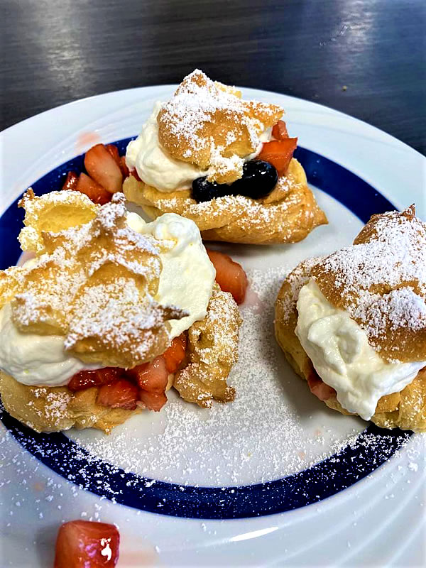 „Meine Windbeutel, sagten sie immer, sind die luftigsten“, erinnert sich eine der Bewohnerin. „Brandteig ist mir immer gut gelungen!“ Bei der Zubereitung der leckeren selbstgemachten Windbeutel mit einer Sahne-Erdbeerfüllung helfen die Bewohnerinnen und Bewohner von HAUS PHÖBE tatkräftig mit und sind sehr konzentriert bei der „Arbeit“.