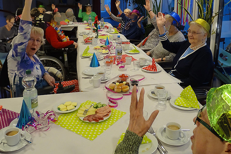 Frühstück mit allen Frauen von allen drei Ebenen im HAUS PHÖBE – so fing Weiberfastnacht genau richtig an! Im entsprechend bunt dekorierten Multifunktionsraum wurde zusammen frische Brötchen, leckere Frühstückseier und Mini-Berliner gefrühstückt. Anschließend gab es ein Glas Sekt zum Anstoßen.