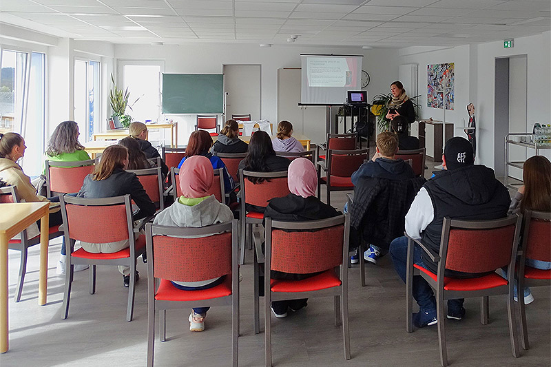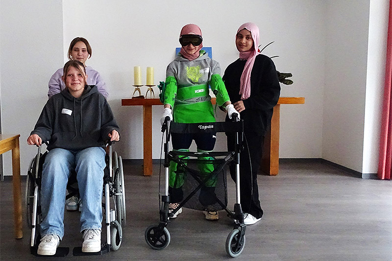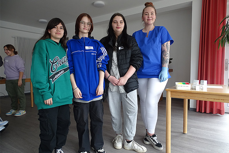 Im Anschluss konnten die Schüler *innen an verschieden Stationen praktische sowie auch theoretische Einblicke in den Berufsalltag eine Pflegefachkraft gewinnen. Was ist beim Stellen von Tabletten zu beachten? Wie messe ich Blutdruck richtig? Was ist bei der Händedesinfektion zu beachten? Wie fühlen sich unterschiedliche Einschränkungen im Alter an? Dabei beeindruckte die Jugendliche der Altersanzug und andere Hilfsmittel, die ihnen einen guten Eindruck vermittelten. Geschichten aus dem „Leben einer Pflegefachkraft“ erzählte Christiane Vössing, Leiterin des Altenheimes, und gab dadurch Einblicke in die Arbeitswelt, die von fröhlichen, dankbaren und traurigen Begebenheiten geprägt ist.