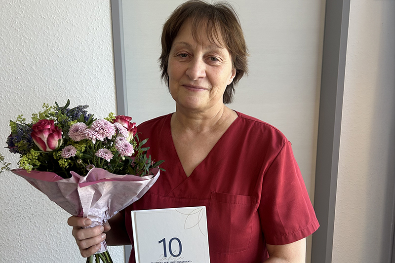 Lydia Rech wurden Blumen sowie ein Buch überreicht, in das viele Kolleg*innen Glückwünsche hineingeschrieben haben. „Ihre praktische Erfahrung in der Pflege und ihr fundiertes Fachwissen ist ein sehr wertvolles Kapital“, fügte die Hausleitung hinzu. „Gerne möchte ich bis zum Ruhestand dem Haus treu bleiben“, erklärt die Geehrte und Carolin Reitemeyer antwortet lachend: „Wir freuen uns auf viele weitere Jahre der guten Zusammenarbeit.“